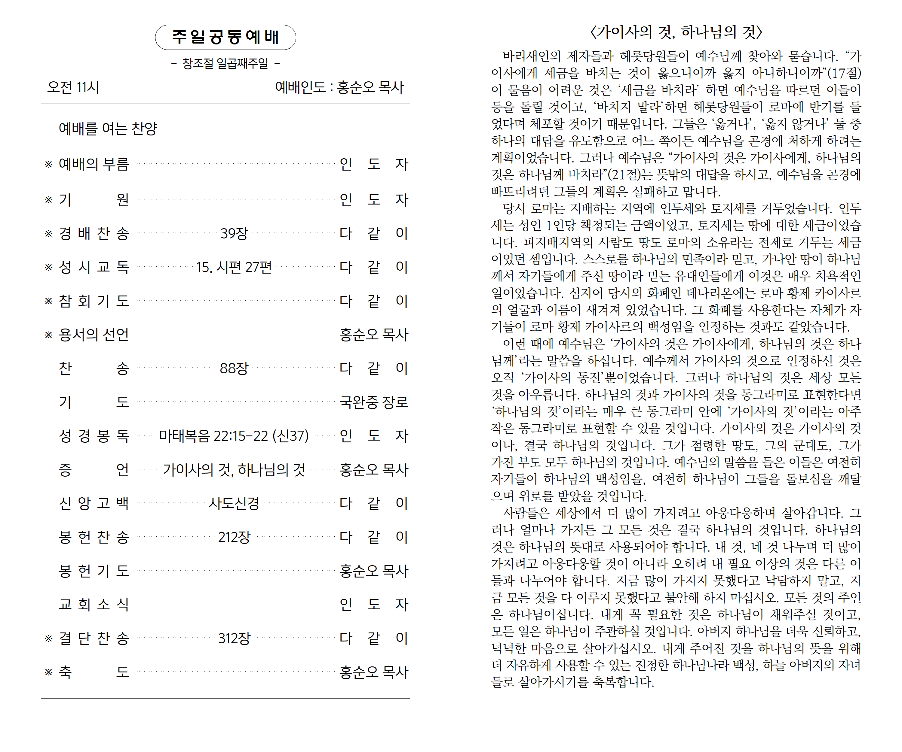 이런 때에 예수님은 ‘가이사의 것은 가이사에게, 하나님의 것은 하나님께’라는 말씀을 하십니다. 예수께서 가이사의 것으로 인정하신 것은 오직 ‘가이사의 동전’뿐이었습니다. 그러나 하나님의 것은 세상 모든 것을 아우릅니다. 하나님의 것과 가이사의 것을 동그라미로 표현한다면 ‘하나님의 것’이라는 매우 큰 동그라미 안에 ‘가이사의 것’이라는 아주 작은 동그라미로 표현할 수 있을 것입니다. 가이사의 것은 가이사의 것이나, 결국 하나님의 것입니다. 그가 점령한 땅도, 그의 군대도, 그가 가진 부도 모두 하나님의 것입니다. 예수님의 말씀을 들은 이들은 여전히 자기들이 하나님의 백성임을, 여전히 하나님이 그들을 돌보심을 깨달으며 위로를 받았을 것입니다.
