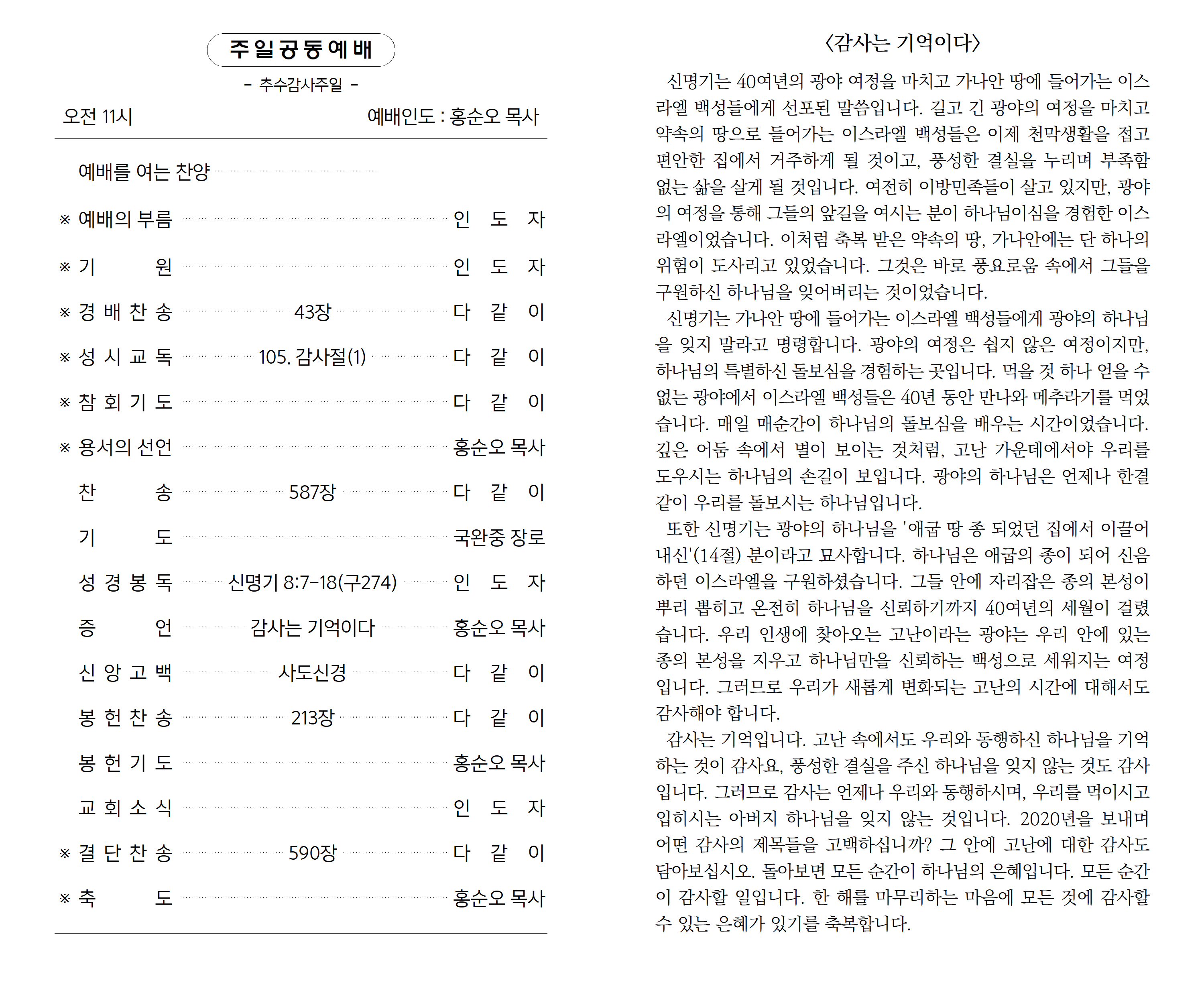 감사는 기억입니다. 고난 속에서도 우리와 동행하신 하나님을 기억하는 것이 감사요, 풍성한 결실을 주신 하나님을 잊지 않는 것도 감사입니다. 그러므로 감사는 언제나 우리와 동행하시며, 우리를 먹이시고 입히시는 아버지 하나님을 잊지 않는 것입니다. 2020년을 보내며 어떤 감사의 제목들을 고백하십니까? 그 안에 고난에 대한 감사도 담아보십시오. 돌아보면 모든 순간이 하나님의 은혜입니다. 모든 순간이 감사할 일입니다. 한 해를 마무리하는 마음에 모든 것에 감사할 수 있는 은혜가 있기를 축복합니다.