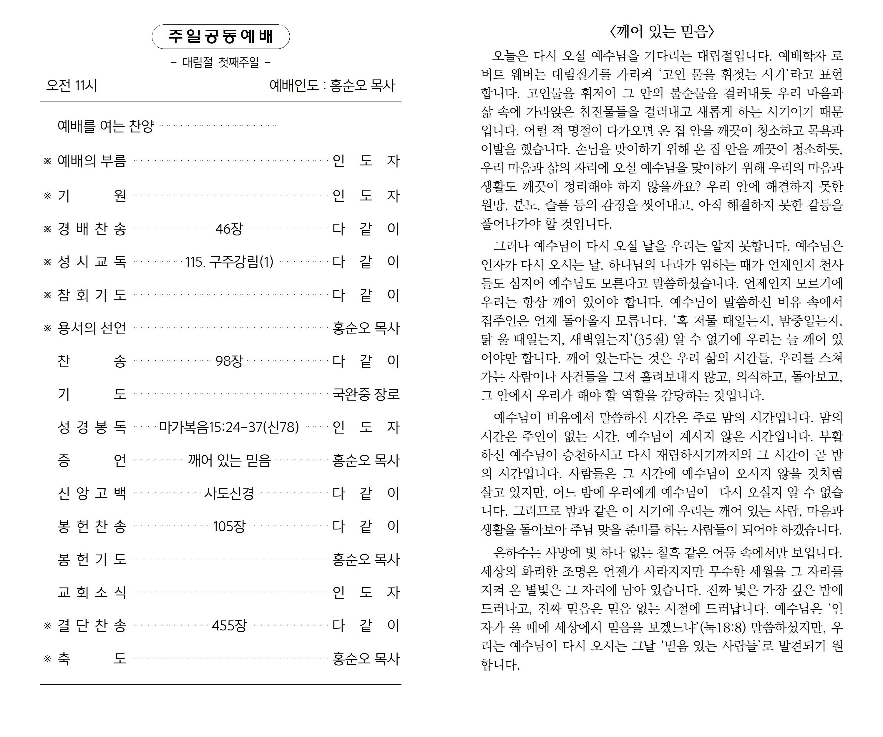 그러나 예수님이 다시 오실 날을 우리는 알지 못합니다. 예수님은 인자가 다시 오시는 날, 하나님의 나라가 임하는 때가 언제인지 천사들도 심지어 예수님도 모른다고 말씀하셨습니다. 언제인지 모르기에 우리는 항상 깨어 있어야 합니다. 예수님이 말씀하신 비유 속에서 집주인은 언제 돌아올지 모릅니다. ‘혹 저물 때일는지, 밤중일는지, 닭 울 때일는지, 새벽일는지’(35절) 알 수 없기에 우리는 늘 깨어 있어야만 합니다. 깨어 있는다는 것은 우리 삶의 시간들, 우리를 스쳐 가는 사람이나 사건들을 그저 흘려보내지 않고, 의식하고, 돌아보고, 그 안에서 우리가 해야 할 역할을 감당하는 것입니다.