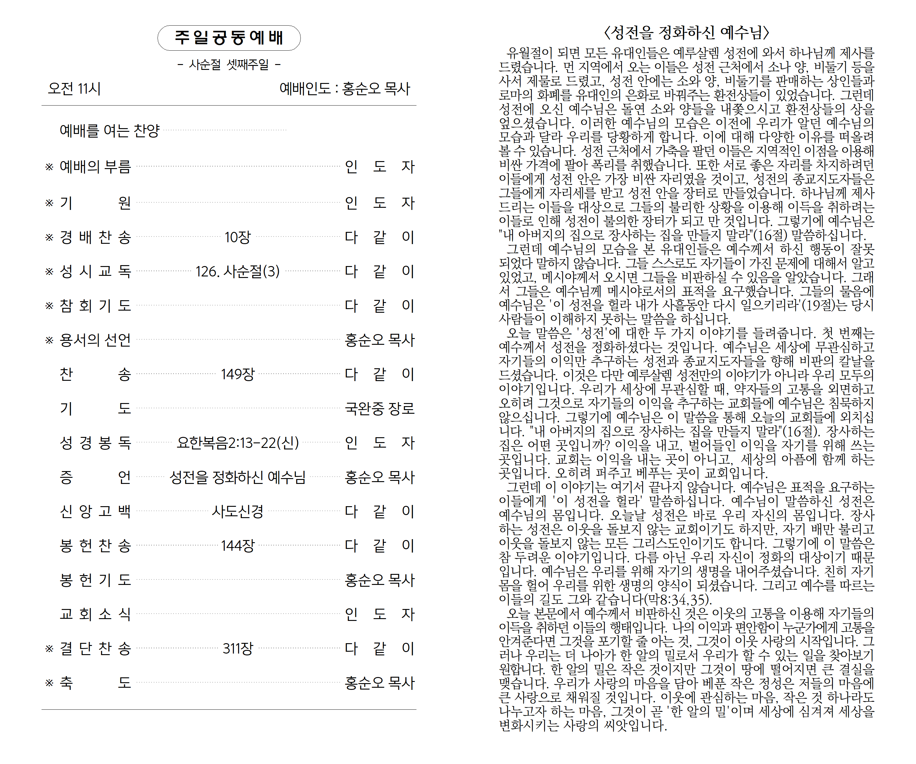 오늘 말씀은 '성전'에 대한 두 가지 이야기를 들려줍니다. 첫 번째는 예수께서 성전을 정화하셨다는 것입니다. 예수님은 세상에 무관심하고 자기들의 이익만 추구하는 성전과 종교지도자들을 향해 비판의 칼날을 드셨습니다. 이것은 다만 예루살렘 성전만의 이야기가 아니라 우리 모두의 이야기입니다. 우리가 세상에 무관심할 때, 약자들의 고통을 외면하고 오히려 그것을 이용하여 자기들의 이익을 추구하는 교회들에 예수님은 침묵하지 않으십니다. 그렇기에 예수님은 이 말씀을 통해 오늘의 교회들에 외치십니다. "내 아버지의 집으로 장사하는 집을 만들지 말라"(16절) 장사하는 집은 어떤 곳입니까? 이익을 내고, 벌어들인 이익을 자기를 위해 쓰는 곳입니다. 교회는 이익을 내는 곳이 아니고, 세상의 아픔에 함께 하는 곳입니다. 오히려 퍼주고 베푸는 곳이 교회입니다.