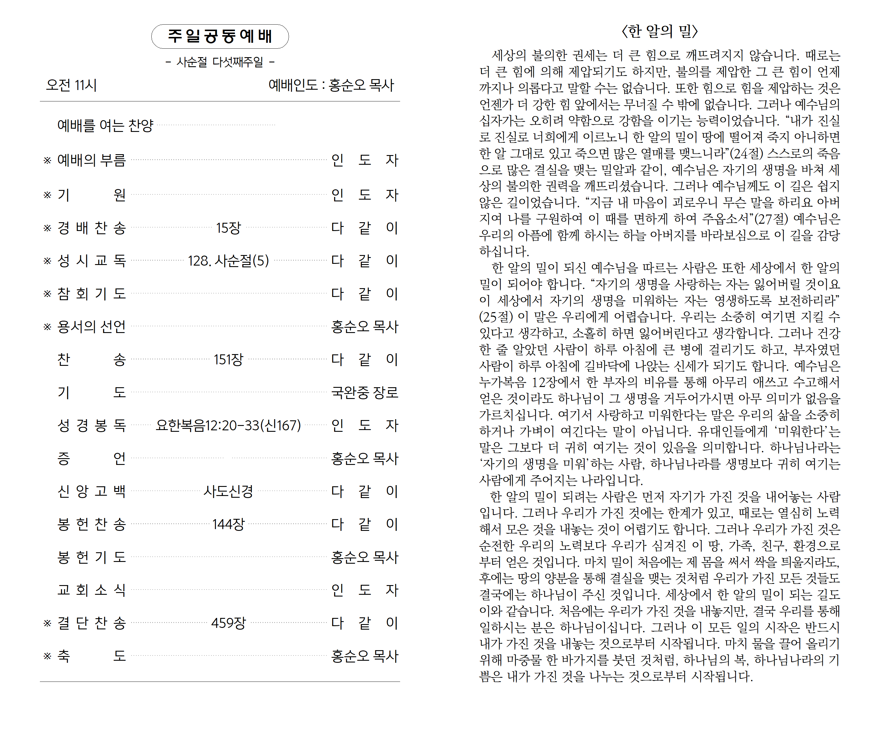 24 내가 진실로 진실로 너희에게 이르노니 한 알의 밀이 땅에 떨어져 죽지 아니하면 한 알 그대로 있고 죽으면 많은 열매를 맺느니라