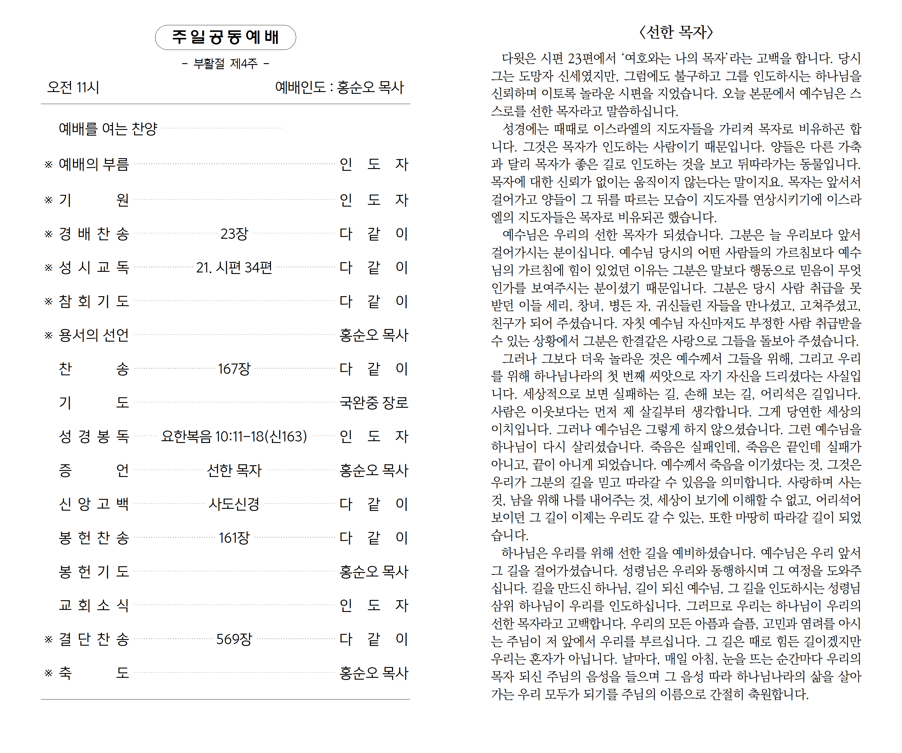 하나님은 우리를 위해 선한 길을 예비하셨습니다. 예수님은 우리 앞서 그 길을 걸어가셨습니다. 성령님은 우리와 동행하시며 그 여정을 도와주십니다. 길을 만드신 하나님, 길이 되신 예수님, 그 길을 인도하시는 성령님, 삼위 하나님이 우리를 인도하십니다. 그러므로 우리는 하나님이 우리의 선한 목자라고 고백합니다. 우리의 모든 아픔과 슬픔, 고민과 염려를 아시는 주님이 저 앞에서 우리를 부르십니다. 그 길은 때로 힘든 길이겠지만 우리는 혼자가 아닙니다. 날마다, 매일 아침, 눈을 뜨는 순간마다 우리의 목자 되신 주님의 음성을 들으며 그 음성 따라 하나님나라의 삶을 살아가는 우리 모두가 되기를 주님의 이름으로 간절히 축원합니다.