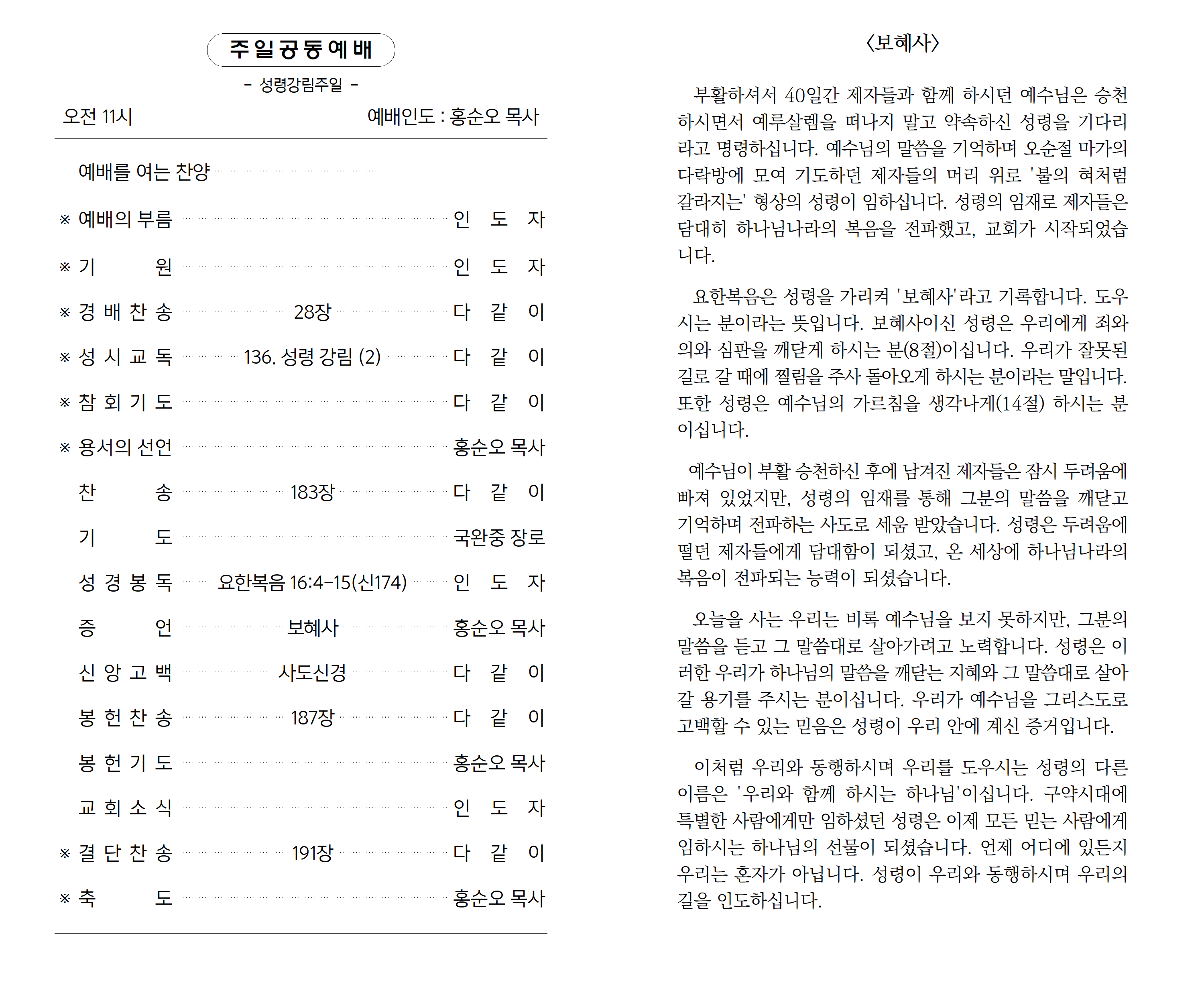 예수님이 부활 승천하신 후에 남겨진 제자들은 잠시 두려움에 빠져 있었지만, 성령의 임재를 통해 그분의 말씀을 깨닫고 기억하며 전파하는 사도로 세움 받았습니다. 성령은 두려움에 떨던 제자들에게 담대함이 되셨고, 온 세상에 하나님나라의 복음이 전파되는 능력이 되셨습니다.