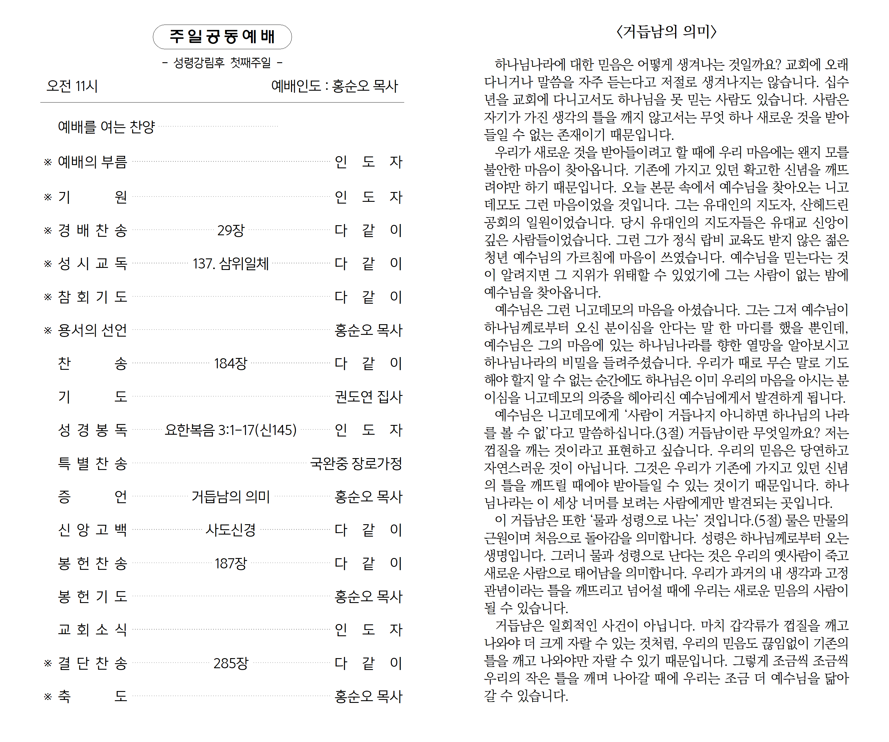 이 거듭남은 또한 ‘물과 성령으로 나는’ 것입니다.(5절) 물은 만물의 근원이며 처음으로 돌아감을 의미합니다. 성령은 하나님께로부터 오는 생명입니다. 그러니 물과 성령으로 난다는 것은 우리의 옛사람이 죽고 새로운 사람으로 태어남을 의미합니다. 우리가 과거의 내 생각과 고정관념이라는 틀을 깨뜨리고 넘어설 때에 우리는 새로운 믿음의 사람이 될 수 있습니다.